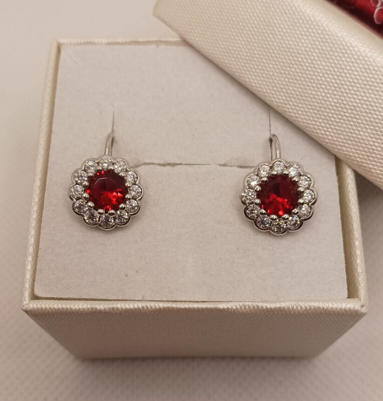 Stříbrné náušnice na patent - s kameny - synt. kámen: kubická zirkonie (CZ) červená