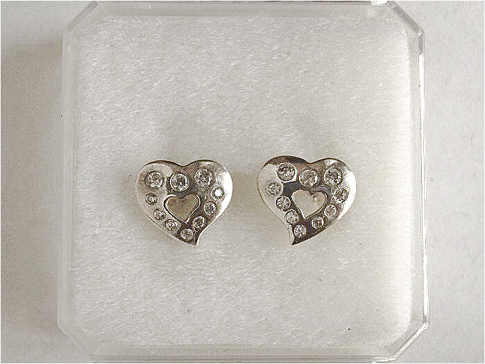 Stříbrné náušnice na šroubek - se zirkony - srdíčka - povrchová úprava: pokovené rhodiem (antialergenní)