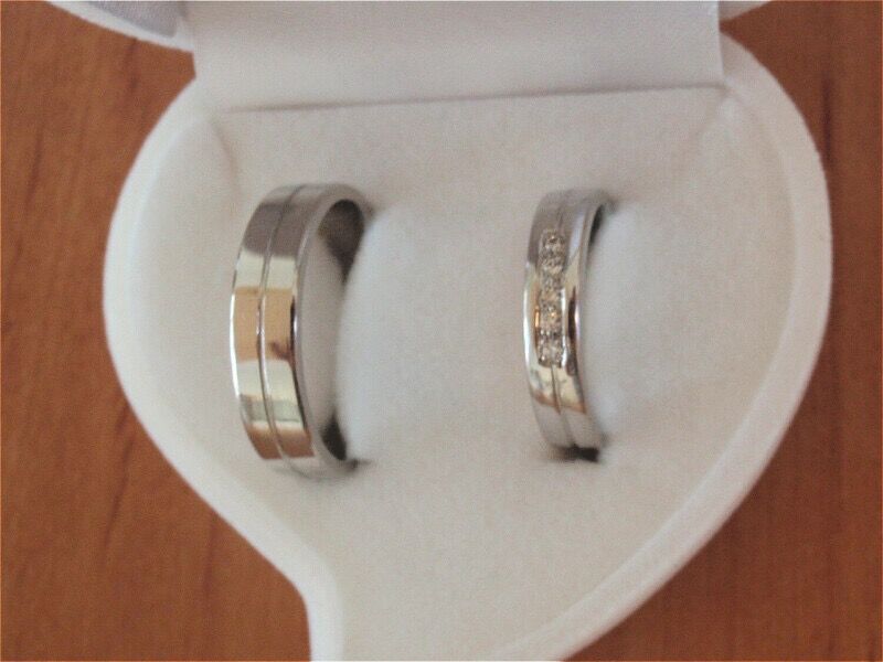 Zlaté snubní prsteny - pánský s drážkou, dámský s kameny