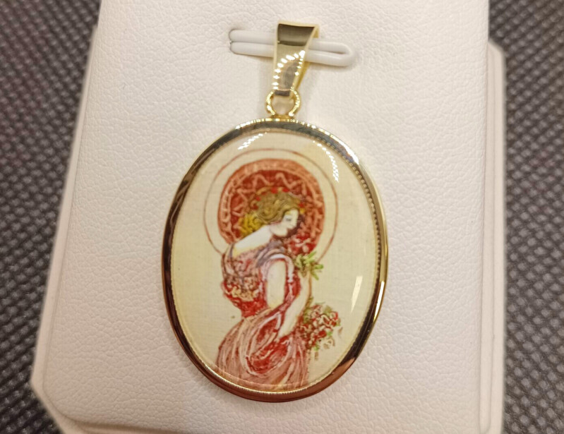 Ručně malovaná madonka s motivem od Alfonse Muchy.